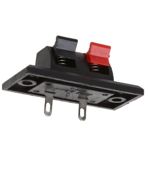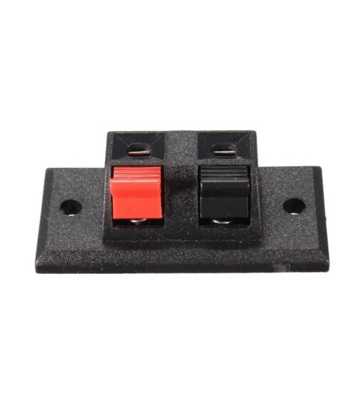 فیش یا پنل ترمینال بلندگو یا ترمینال باکس اسپیکر، از نوع دوتایی دارای دو اهرم به رنگ های قرمز و مشکی جهت اتصال سیم بلندگو دو رشته و انتقال صدای مونو یک کانال بین سیستم صوتی و اسپیکر و باند. ابعاد شامل طول: 3.8 * عرض 1.8 * ژرفا 1.5 سانتیمتر، جنس بدنه پلاستیکی، رنگ بدنه مشکی، دارای دو پایه فلزی و دو جایگاه پیچ جهت تعمیر و نصب بر روی سطوح گوناگون باکس، جعبه و..