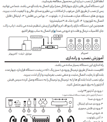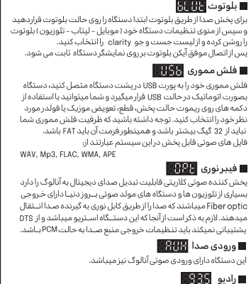 | ورودی ها | AUX, Bluetooth 5.0, Headphone Jack, Optical Fiber, USB |